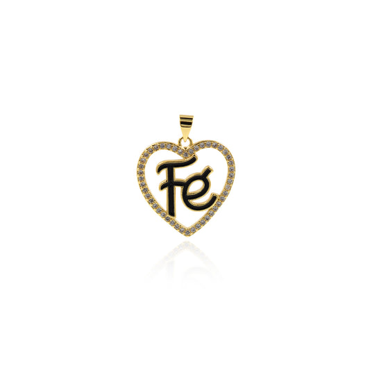 18k Gold Filled "Fe" Faith Clear Cubic Zirconia Heart Pendant Charm Faith Charm 23x25mm