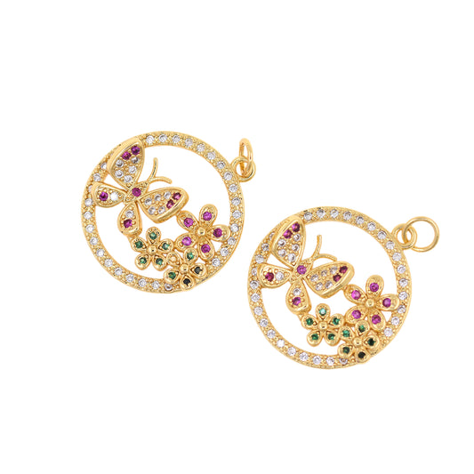 18K Gold Filled Zircon Butterfly Pendant, Round Butterfly Pendant 21.5mm