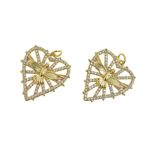 Micropavé Heart Bird Charm, Brass Openwork Necklace Pendant 24x22mm