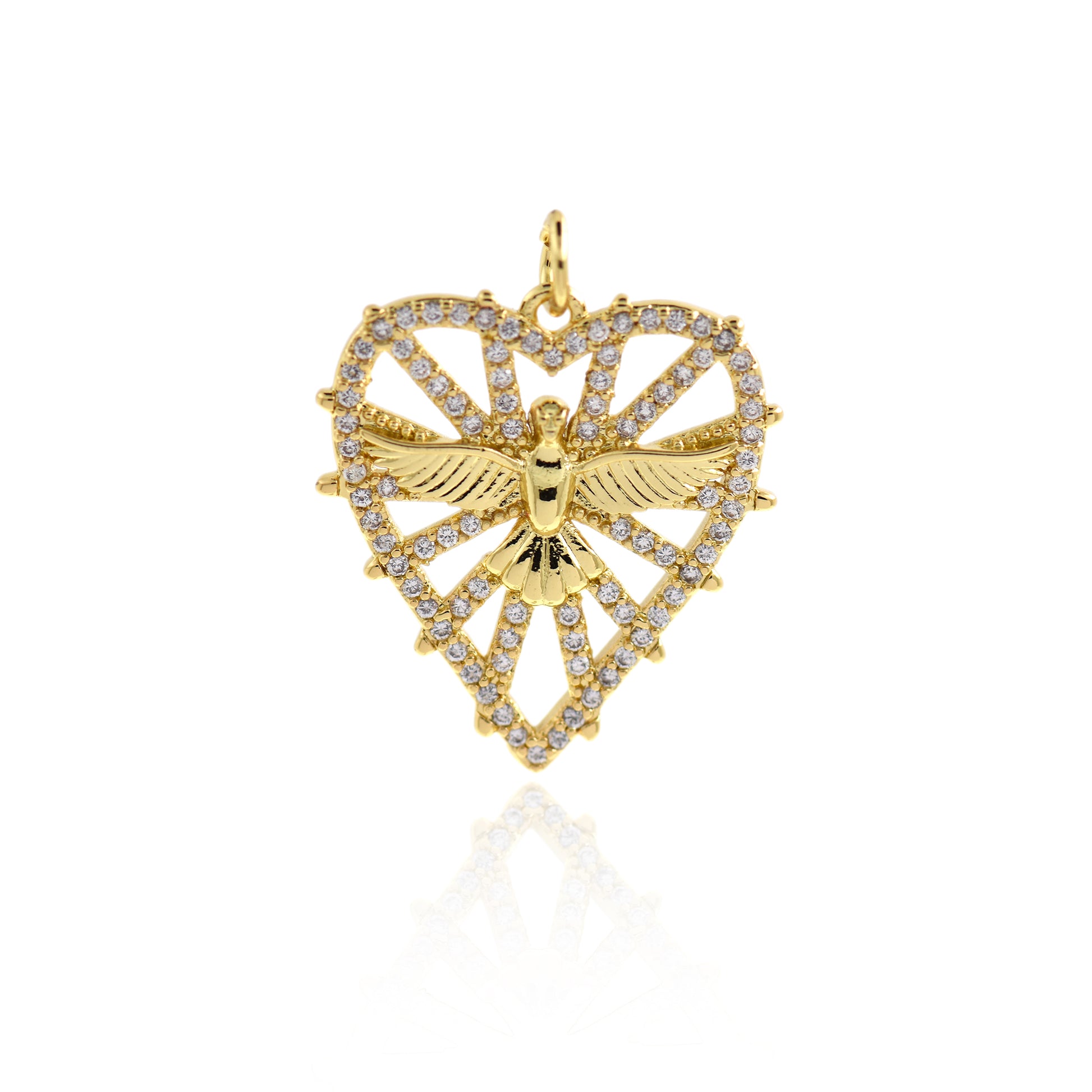 Micropavé Heart Bird Charm, Brass Openwork Necklace Pendant 24x22mm